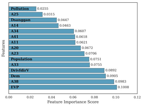 A feature importance analysis was conducted using the trained RF model to quantify the relative influence of each predictor variable, as detailed in Section 3.2.5. The analysis, summarized in Figure 3, identified the most significant drivers of fluoride distribution. Among meteorological factors, annual mean evaporation (EVP) emerged as a highly influential predictor (MDI = 0.1008). Topography also played a critical role, with ground surface elevation (DEM) being the most influential predictor (MDI = 0.0983), followed by vertical distance to rivers (DrivfdirV) and distance to the Sanggan River (Dsanggan). Furthermore, population also emerged as a significant anthropogenic predictor of groundwater fluoride.