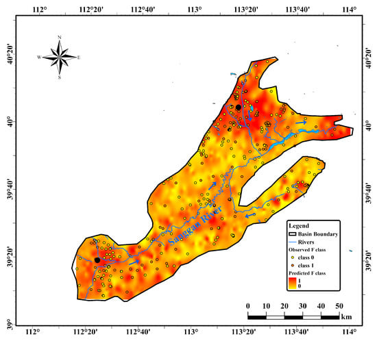Leveraging the superior performance of the embedding-enhanced SVM model, a predictive risk map for groundwater fluoride across the Datong Basin was generated (Figure 4). The map highlights a pronounced spatial heterogeneity in fluoride distribution, identifying the central and northern parts of the plain as the primary high-risk zones (F− > 1.0 mg/L).