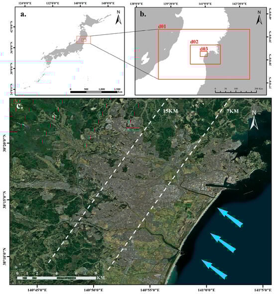 Geographic extent and numerical modeling grid. (a) Map of Japan; (b) nested domains; (c) satellite view of Domain 3, showing the coastal zone (0–7 km), urban zone (7–15 km), and inland zone (>15 km). Arrows indicate the direction of the sea breeze.