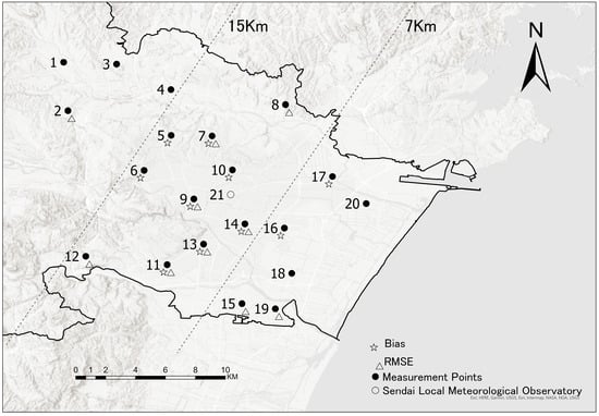 The reproducibility of the WRF model data was evaluated by pairing simulated outputs with actual measurements at corresponding points for comparative analysis. The simulation points were uniformly distributed in the simulation domain, whereas the measurement points were randomly distributed in the playgrounds of each elementary school in Sendai. Therefore, there was a certain deviation in the positions of the simulated and measured points, and they did not coincide completely. Since the simulated points uniformly covered the entire study area, there was always a point closest to the measured point. Each monitoring station was matched to its nearest model grid point for data comparison. Table 2 lists the specific locations and distances between the measured and simulated points.