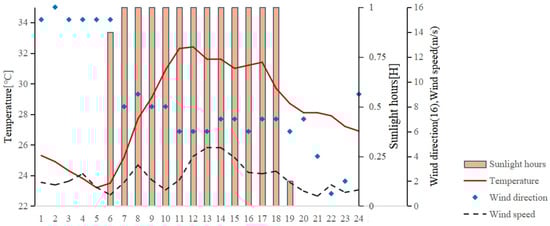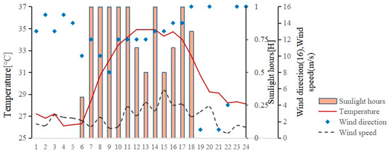 Meteorological parameters for 5 August 2016 encompassed sunlight duration, temperature, wind direction, and wind speed. Note: the wind direction scale of 1–16 denotes the 16 compass directions, where 1: N, 2: NNE, 3: NE, …, 16: NNW.