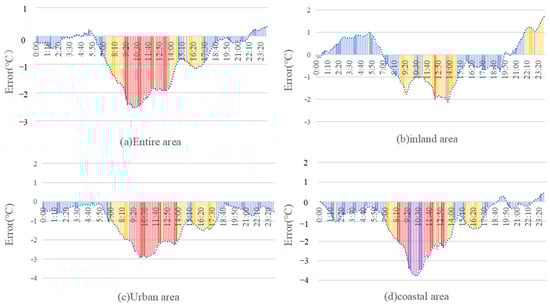 According to Section 3.1, the difference between the observed and simulated data was regional, whereas that of the meteorological data was temporal. Therefore, an error analysis of the observed and simulated data for 24 h a day was conducted from different partitions (inland, urban, and coastal areas) to further analyze the difference between the observed and simulated data. The error is defined as follows: Let the Nth measured value at measurement point A be An and select the simulation point B that is closest to measurement point A in spatial location, with its Nth simulated value denoted as Bn. The deviation between the simulated and measured results is then quantified by calculating the difference between the Nth values of these two points, i.e., the deviation value Xn = Bn − An. In other words, Xn = Bn − An. The average temperature at each time point was used for the error calculation, which was calculated separately for the entire area and the three partitions.