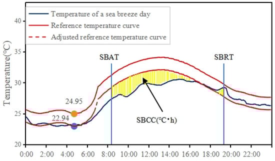 Therefore, all temperature values on westerly days must be adjusted. The specific method of adjustment was to extract the lowest temperature value in the morning of the west wind day (orange point in Figure 6) and then find the temperature value of the sea breeze day at the same time (blue point in Figure 6). The temperature difference between these two values represents a uniform offset that was subtracted from all temperature values on the westerly wind day to establish a comparable baseline before the sea breeze influence. After the temperature of the west wind day was adjusted, the SBCC was calculated.