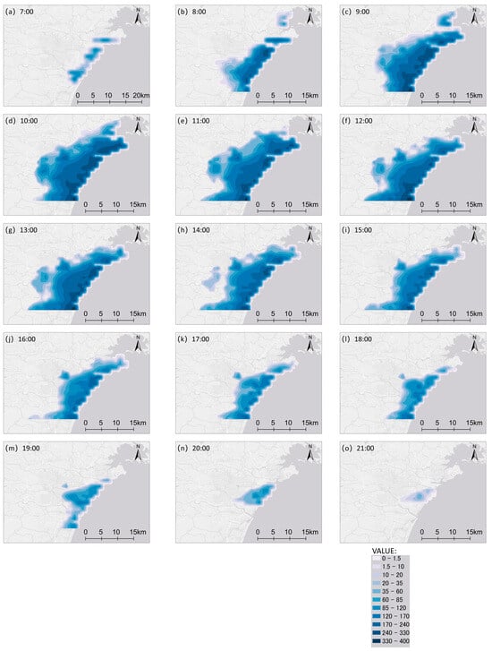 After visualizing the data using ArcGIS Pro, the changes in the SBCC and cooling range could be visualized intuitively. The change process starts with a small intensity and range at 07:00, gradually increases and diffuses, and then gradually decreases and shrinks (Figure 8). Moreover, the sea breeze cooling range is geographically distributed in different time periods in the study area.
