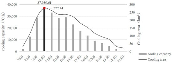 After 10:00, the cooling capacity and range began to decline; between 10:00 and 13:00, the decline rate was slower; and from 12:00 to 13:00, there was a small increase. After 13:00, the cooling capacity and cooling range exhibited a continuously declining trend and the rate of decline was more uniform.