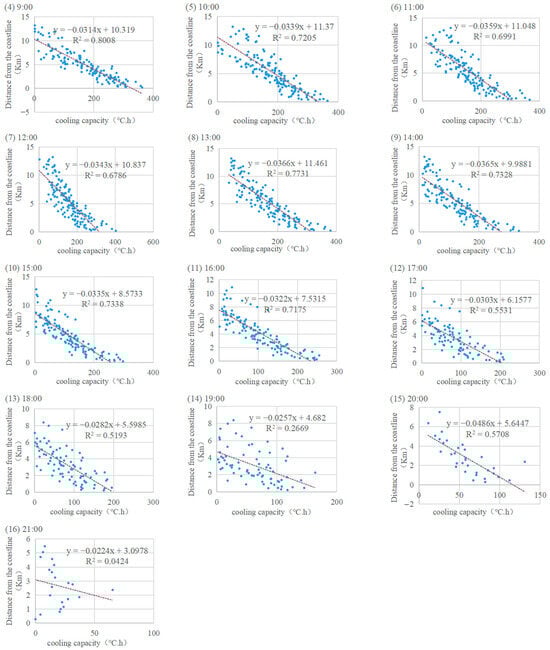 Figure 10 shows the scatter plot and trend line of the total cooling capacity and hourly cooling capacity of the sea breeze versus distance for all sea breeze cooling actions. The formula and value of R squared are attached. All relationships except for 07:00 were positive and had a low fit (R2 = 0.0083). The remaining time showed a negative correlation with a good fit from 08:00 to 16:00. The sea breeze cooling capacity (SBCC) exhibits a strong negative correlation with distance from the coast, indicating significantly enhanced cooling effects in areas closer to the shoreline.