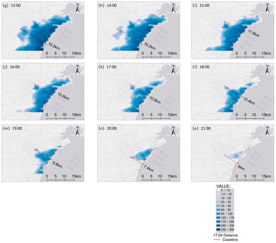 To quantify the inland advancement of sea breeze cooling, hourly measurements determined the maximum penetration distance from the coastline (Figure 11). This distance, representing the farthest extent of the cooling influence, was individually assessed according to the sea breeze cooling spatial distribution maps and coastal wind direction.