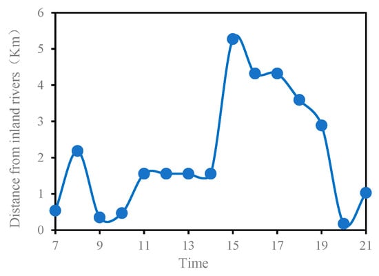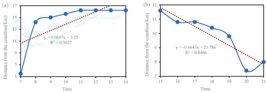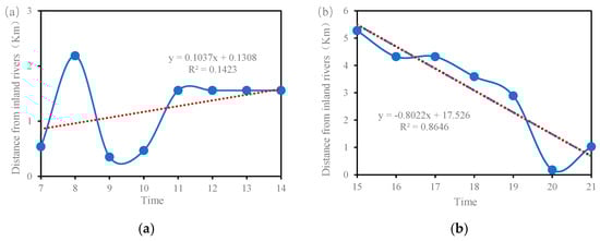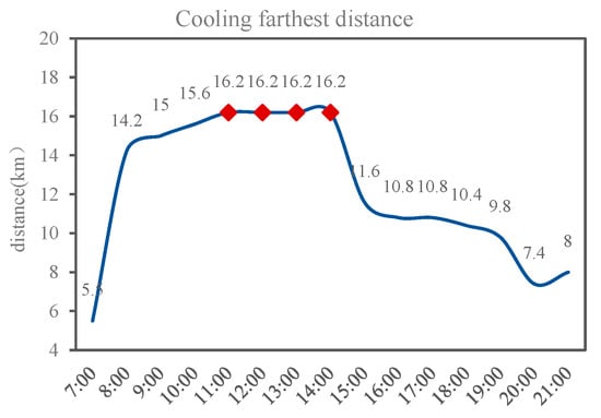 At 07:00, the longest distance was 5.5 km; the 08:00 distance rapidly increased to 14.2 km; at 11:00, the cooling distance reached 16.2 km; and after 14:00, it quickly decreased. Subsequently, a downward trend is observed (Figure 12). In terms of the relationship between the cooling distance and time (Figure 13), there was a positive correlation from 07:00 to 14:00, and the correlation coefficient was 0.71 after calculation. There was an obvious negative correlation from 15:00 to 21:00 and the correlation coefficient was −0.92.