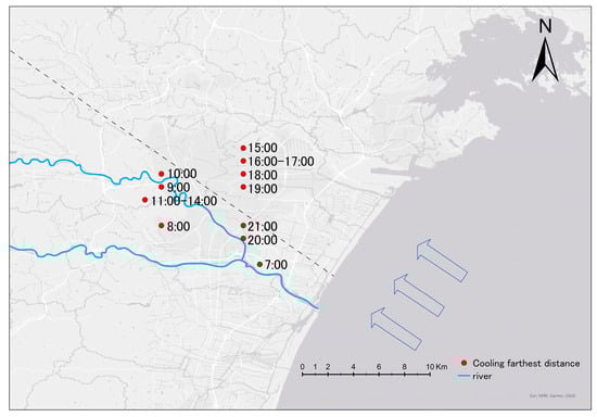 Building on prior analyses of Sendai’s sea breeze daily patterns, this study selected the three-year period from summer 2018 to 2020. This period closely matched the 12-year average daily temperature curve for sea breezes (summers 2010–2021). Given that sea breezes arrive between 11:00 and 12:00 on over 60% of days when the maximum temperatures exceed 30 °C [], we focused specifically on sea breeze days with arrival times at these two hours. To meet the required meteorological conditions, only days with a stable wind direction after the sea breeze made landfall were included. Finally, 5 August 2016 (Figure 3) was selected as the study day of a “sea breeze day” in this study.