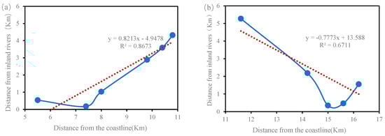 This section examines the relationship between the SBCC and distance. Here, distance is defined as the measurement along the sea breeze direction from the coastline to the location where its cooling effect is observed. The associations of both the cumulative and hourly SBCC with distance under all observed sea breeze cooling events were analyzed.