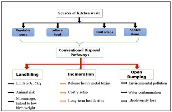 Kitchen waste has high organic content and is a readily available and underutilized biomass resource for biochar production [31]. Kitchen waste includes peels, leftover food, vegetable scraps, and spoiled items [32]. Nowadays, kitchen waste is utilized frequently, which not only addresses the main issue of solid waste management but also contributes to a greener step towards circular economy. Decomposed kitchen waste affects human health as it leads to carcinogenic diseases and can also affect the nervous system, kidneys, as well as liver [12]. Furthermore, during landfilling practices, the emission of harmful pollutants such as sulphur dioxide and other harmful gases are released [33]. Figure 1 demonstrates the primary sources of kitchen waste sources and their conventional disposal pathways. The study by Vianna and Polan highlighted the risks associated with the unmanaged risk. Authors reported that people who are living near the dump yards face risks during childbirth [34]. These complications arise due to the exposure of harmful vapors from dump yards and contamination in the nearby sites of living area [34]. The newborn child faces the risk of lower weight, birth defect rates, miscarriage, and other complications. This highlights the importance of utilizing kitchen waste in controlled valorization processes. Researchers nowadays focus on these kinds of issues and are taking steps toward the utilization of waste to reduce the load on landfilling. Food waste, which largely overlaps with kitchen waste, contains various components such as cellulose, hemicellulose, and fats, which require specialized treatment methods. In the past, landfilling and incineration were common practices of managing food waste, which caused various disadvantages. Landfilling causes damage to human, animal, as well as environmental health [35]. At landfilling sites, animals eat waste food, which worsens their condition. Also, incineration near plant areas causes damage to them and is costly. Moreover, the burning of food waste releases toxic pollutants and heavy metals. Therefore, recycling of kitchen/food waste is an effective way towards a cleaner environment. A thermochemical process, pyrolysis, is an effective method for managing the waste [29]. It reduces a large amount of waste volume by using them as feedstock. Pyrolysis provides flexibility in operating parameters to prepare materials according to needs [29]. Studies have demonstrated that kitchen waste serves not only as an abundant and low-cost feedstock but also as a strategic input for sustainable environmental management.