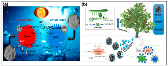 (a) Degradation mechanism of methyl orange (MO) and tetracycline (TC) using KBC/BiOBr, BiOCl as photocatalysts [11]; (b) impact of biochar amendment on soil water retention and plant transpiration sites.