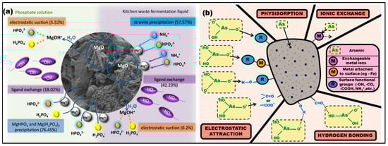 (a) Mechanistic representation of phosphorus adsorption using MgO-coated tea waste biochar [85]; (b) schematic illustration of arsenic removal mechanisms by kitchen waste-derived biochar [82].