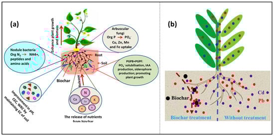 (a) Mechanism of plant growth promotion through interactions among biochar, soil, microbes, and plant [29]; (b) mechanistic representation of immobilization of metal ions using biochar and its influence on metal (Cd and Pb) uptake capacity in swamp cabbage [87].