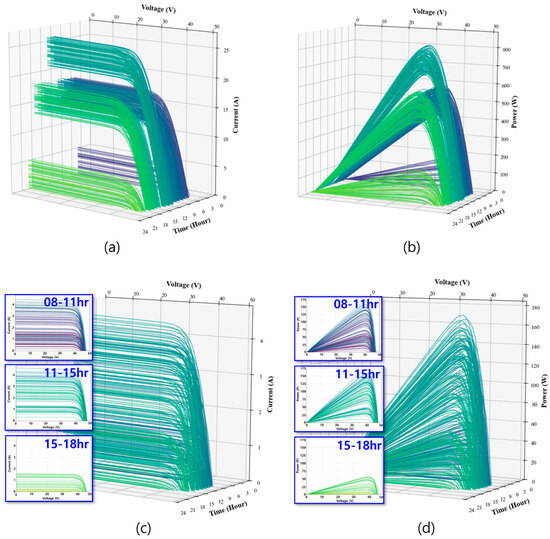 Figure 1 presents the simulated I-V and P-V curves for the two seasonal datasets used in this study, generated using Equations (1) and (2). Figure 1a,b show the characteristics for the spring period, while (c) and (d) represent the more volatile winter period. These curves are based on time-varying temperature and irradiance data over a 30-day period. The color variations in the curves represent different times of the day, with each line corresponding to a specific time point. Using the given temperature and irradiance data, we calculated to find the current in the solar cell. The P–V curve is a plot of the current and voltage V values at each time of day. These values can be used to calculate the power of the solar cell at each time of the day. For this study, we used the following settings: = , = , n = 1.3, = (based on a temperature of 25 ), = 250 = , = , = , solar irradiance at each (based on the given data), , respectively [27].