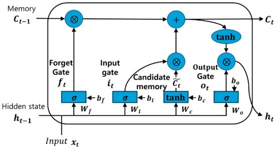 LSTMs are an extension of recurrent neural networks, which were developed to solve the long-term dependence problem of traditional RNNs [30]. LSTMs are designed to effectively learn dependencies in time-series data over long periods of time through an internal gating mechanism [30]. An LSTM cell comprises three core gates: the forget gate, input gate, and output gate [31]. These gates control the flow of information by retaining important information and removing unnecessary information. The forget gate determines the information that should be removed from the state of the cell at a previous point in time. The formula is as follows [31].
