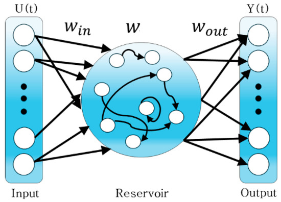 Reservoir computing is a computational model based on dynamic simulations, which provides a structure for efficient processing of complex temporal patterns via nonlinear mapping of input data into a high-dimensional space [32,33]. As a typical implementation, ESNs, a type of RNNs, are effectively applied to problems with temporal dependencies, such as time-series data [17,34]. The core structure of ESNs consists of an input layer, a fixed reservoir, and an output layer [17]. The main feature is that the hidden layer comprises a randomly initialized recurrent network with fixed weights during the learning process [32,33]. This reservoir dynamically projects the input signal into a high-dimensional state space to represent its complex feature and is responsible for the nonlinearity of the entire network [17]. Furthermore, the learning process is simple and fast by learning only the weights of the output layer. This also alleviates the problem of overfitting [17]. Owing to the aforementioned structure, ESNs can effectively avoid the problem of gradient vanishing or runaway, which is common in traditional RNNs, and can achieve good performance with low computation [17,33]. In particular, it utilizes the dynamic nature of reservoirs to represent input sequences in high-dimensional space, making it well suited for prediction and classification problems with complex temporal patterns [32,33].
