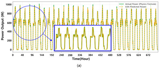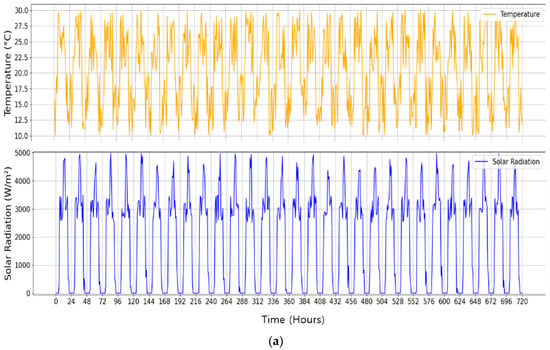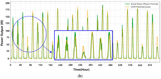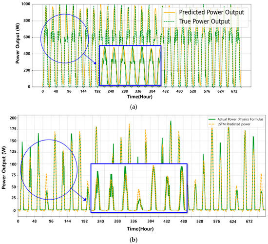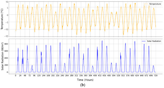 To evaluate without loss of generality of the models across different climatic conditions, this study utilizes two distinct 30-day hourly datasets sourced from South Korea, representing contrasting seasonal patterns. Figure 4 visualizes the time-series data for both datasets used in this study. Figure 4a shows Dataset A, which is characterized by stable, periodic daily patterns with higher temperatures, typical of spring conditions. In contrast, Figure 4b displays Dataset B, which exhibits more variable solar irradiance and significantly lower temperatures, representing more challenging winter conditions. A key aspect of our methodology is that the ‘True Power Output’ for both datasets was generated using the physical model detailed in Section 2 (Equations (1) and (2)). This physics-based ground truth was then used to train and evaluate the models based on an 80% training and 20% test split.