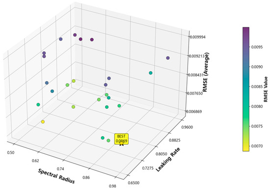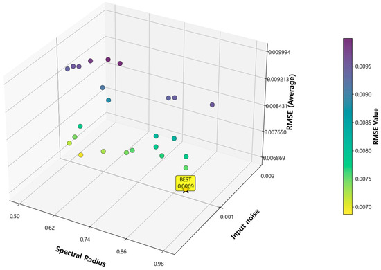 The performance was evaluated by comparing the predicted results with the actual values. The visualization analyzed the relationship between the hyperparameters and RMSE using graphs and 3D graphs comparing the actual data with the predicted values and identified the optimal hyperparameter combinations. The actual power generation was calculated according to the physical formula through Equations (1) and (2). The performance metrics for an ESN model based on optimized hyperparameters are as follows. For the stable spring data, shown in Figure 6a, the optimal hyperparameter combination was a spectral radius of 0.900, the input noise of 0.001, and a leaking rate of 0.750. This configuration achieved a power generation prediction RMSE of 0.0069. For the more challenging winter data, presented in Figure 6b, the best-performing model was configured with a spectral radius of 0.870, input noise of 0.001, and a leaking rate of 0.810. This resulted in an RMSE of 0.0097. Figure 7 and Figure 8 visualize the grid search process, illustrating how the RMSE varies across different hyperparameter combinations.