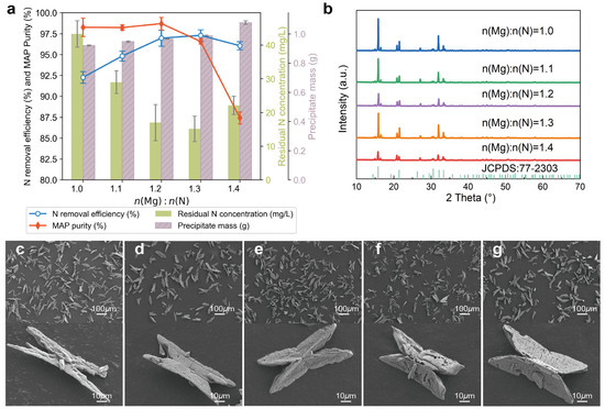 Effect of n(Mg):n(N) on nitrogen removal efficiency and precipitate characteristics. (a) Nitrogen removal efficiency (%), MAP purity (%), residual nitrogen concentration (mg/L, green bars, left y-axis), and precipitate mass (g, purple bars, right y-axis) under varying n(Mg):n(N) molar ratios (1.0–1.4). Line plots show nitrogen removal efficiency (blue) and MAP purity (red). (b) XRD patterns of precipitates formed at different molar ratios, overlaid against the struvite reference (JCPDS: 77-2303). Peak intensity increases with molar ratio, indicating enhanced crystallinity at n(Mg):n(N) = 1.3 (c–g) SEM images of precipitates under n(Mg):n(N) conditions of (c) 1.0, (d) 1.1, (e) 1.2, (f) 1.3, and (g) 1.4. Each includes a 100 μm overview and 10 μm close-up. Morphological differences are minor but may relate to changes in reaction stoichiometry.