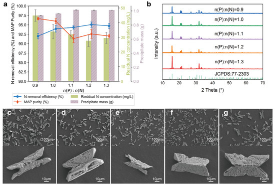 Effect of n(P):n(N) on nitrogen removal efficiency and precipitate characteristics. (a) Nitrogen removal efficiency (%) and MAP purity (%) plotted as lines; residual nitrogen concentration (mg/L, green bars) and precipitate mass (g, purple bars) plotted as bars; (b) XRD patterns of precipitates obtained under different n(P):n(N) ratios, with reference pattern JCPDS: 77-2303 included for comparison; (c–g) SEM images of precipitates formed at different n(P):n(N) ratios: (c) 0.9, (d) 1.0, (e) 1.1, (f) 1.2, and (g) 1.3. Each includes a 100 μm overview and 10 μm close-up. Morphological differences are minor but may relate to changes in reaction stoichiometry.