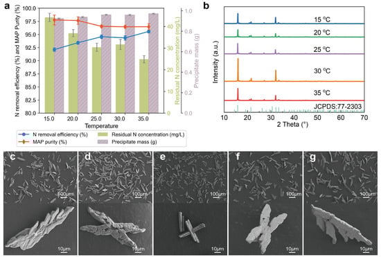 Effect of pH on nitrogen removal efficiency and precipitate characteristics. (a) Variation in nitrogen removal efficiency (%), residual nitrogen concentration (mg/L), MAP purity (%), and precipitate mass (g) under different pH values. Blue line: nitrogen removal efficiency; red line: MAP purity; green bars: residual nitrogen concentration; purple bars: precipitate mass. (b) X-ray diffraction (XRD) patterns of precipitates at different pH levels, showing the characteristic peaks of struvite (JCPDS: 77-2303). The intensity and sharpness of peaks vary with pH, indicating differences in crystallinity. (c–g) Scanning electron microscopy (SEM) images of precipitates at pH 8.0 (c), 8.5 (d), 9.0 (e), 9.5 (f), and 10.0 (g). Each image includes a full view (top: 100 μm scale) and a close-up (bottom: 10 μm scale). Morphological transitions can be observed from irregular to more elongated and defined crystal structures as pH increases.