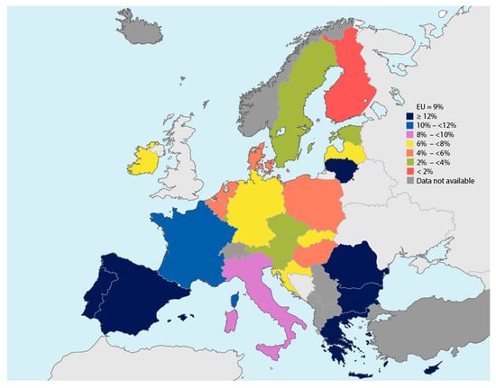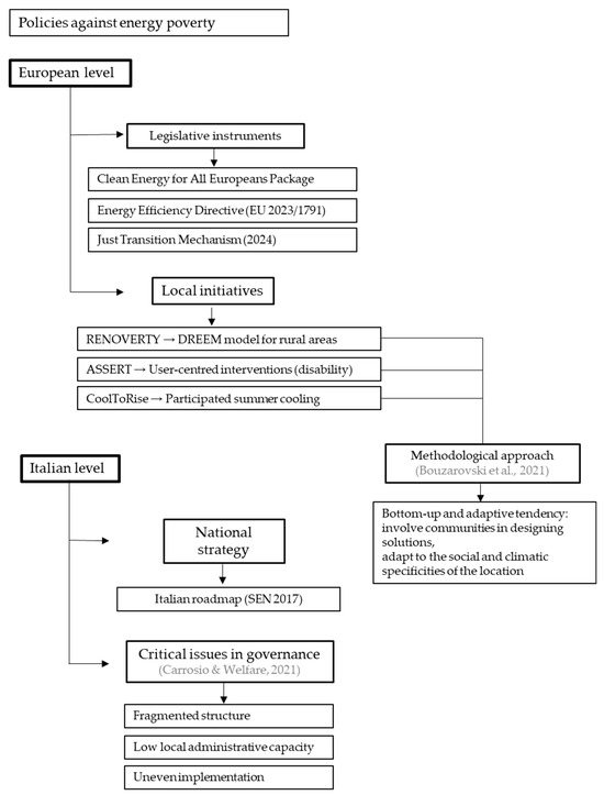 Table 2 outlines the major legislative and programmatic instruments, ranging from the EU’s Clean Energy for All Europeans Package (2019) [17,45] to national strategies such as Italy’s 2017 roadmap [60]. The Energy Efficiency Directive (EU 2023/1791) mandates Member States to include energy poverty reduction in national energy savings plans [17], while the Just Transition Mechanism mobilizes climate finance for vulnerable regions (European Commission, 2024) [61] (Figure 8).