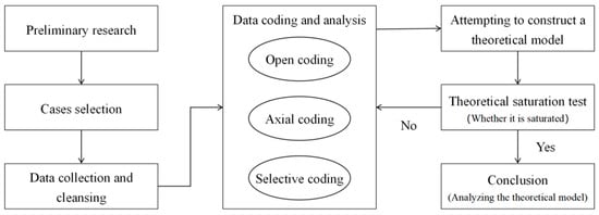 The concept of grounded theory was initially put forward by Glaser and Strauss in 1967. This qualitative research methodology involves the systematic analysis of information and data to develop theories, particularly in the context of process-based problems [53]. The utilization of this method is particularly well-suited for the interpretation of process-related issues. It identifies dynamic processes and patterns of change by means of a systematic summary of complex and detailed social phenomena. In practice, the grounded theory research method involves the following steps: first, the collected information is broken up; second, it jumps out of the established theoretical framework; third, new concepts are given to the original information; and fourth, the information is recombined in other ways [54]. Ultimately, the method draws the final conclusions from the layers of generalization and distillation. Concurrently, memos are meticulously prepared to encapsulate analytical insights that subsequently inform the development of the core category, a pivotal concept for integrating emerging theory [55].