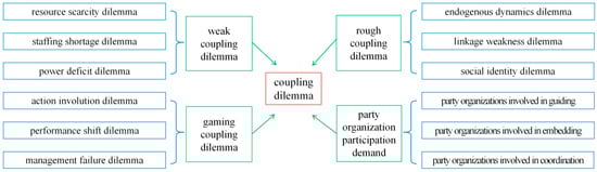 Taking the dilemmas and problems faced in the process of urban governance as an example, after the collation of open coding, it can be seen that the original statements were gradually integrated into 36 Initial concepts and then merged and summarized into 12 the concept of categorization. They are resource scarcity dilemma, staffing shortage dilemma, power deficit dilemma, endogenous dynamics dilemma, linkage weakness dilemma, social identity dilemma, action involution dilemma, performance shift dilemma, management failure dilemma, party organizations involved in guiding, party organizations involved in embedding, and party organizations involved in coordination.