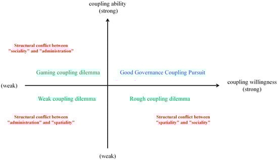 This study diverges from the conventional characterization of the challenges confronting urban governance by introducing the concept of “coupling” into the analytical process. This innovation entails the integration of the theory of embedded governance, offering a novel approach to understanding urban governance issues. The concept of “coupling” was originally developed within the domain of natural sciences, finding extensive application in disciplines such as communication engineering and software engineering. Subsequently, the term has been progressively expanded to encompass management, sociology, and other disciplines, thereby facilitating the description and explanation of the interrelationships between various subjects within the domain of management. Embedded governance is characterized by an emphasis on the internal relationship between the embedded subject and object, as well as the mechanisms of embedding. This focus, to a certain extent, overlooks the fact that the characteristics of “spatiality,” “administration,” “sociality,” and others present a unique opportunity to comprehend the intricacies of urban governance. These characteristics offer varied perspectives that facilitate a more nuanced understanding of the urban governance dilemma. In this study, we examine the issues that emerge from the interactions between the aforementioned characteristics. We develop a spatial coordinate system based on the concept of the “coupling effect,” with coupling willingness serving as the horizontal coordinate and coupling ability as the vertical coordinate, as illustrated in Figure 3. The major categories obtained by axial coding are subsequently analyzed.