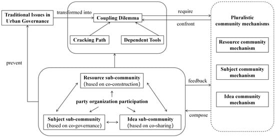The urban governance community model in the broad sense contains several dimensions: (1) identification and transformation of problems, (2) the need for relevant community mechanisms, (3) the process by which the model works, and (4) the prevention of possible future problems. The narrower urban governance community is defined as the process of the model in solving urban problems, i.e., party organization participation and the three sub-communities of Resource sub-community, Subject sub-community, and Idea sub-community.