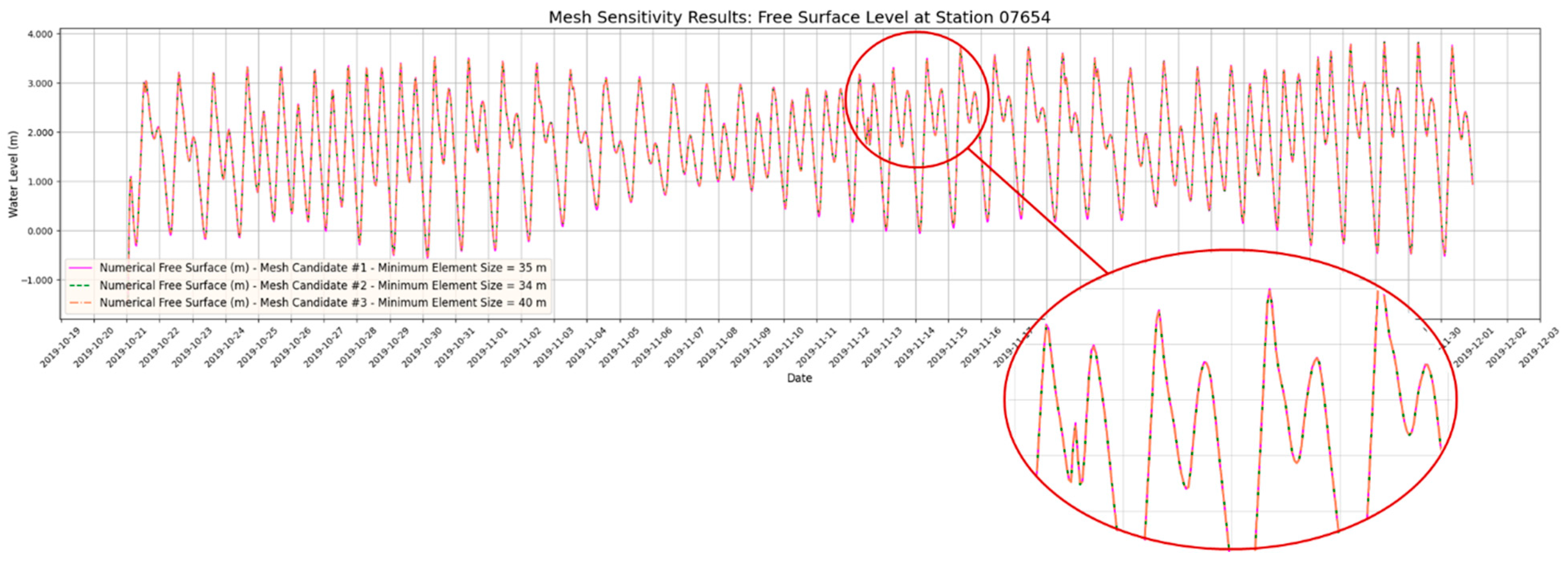 Mesh Candidate | Minimum Element Size (m) | Maximum Element Size (m) | Maximum Element Size Near Shores (m) | Mesh Gradation | Node Count | Element Count |
