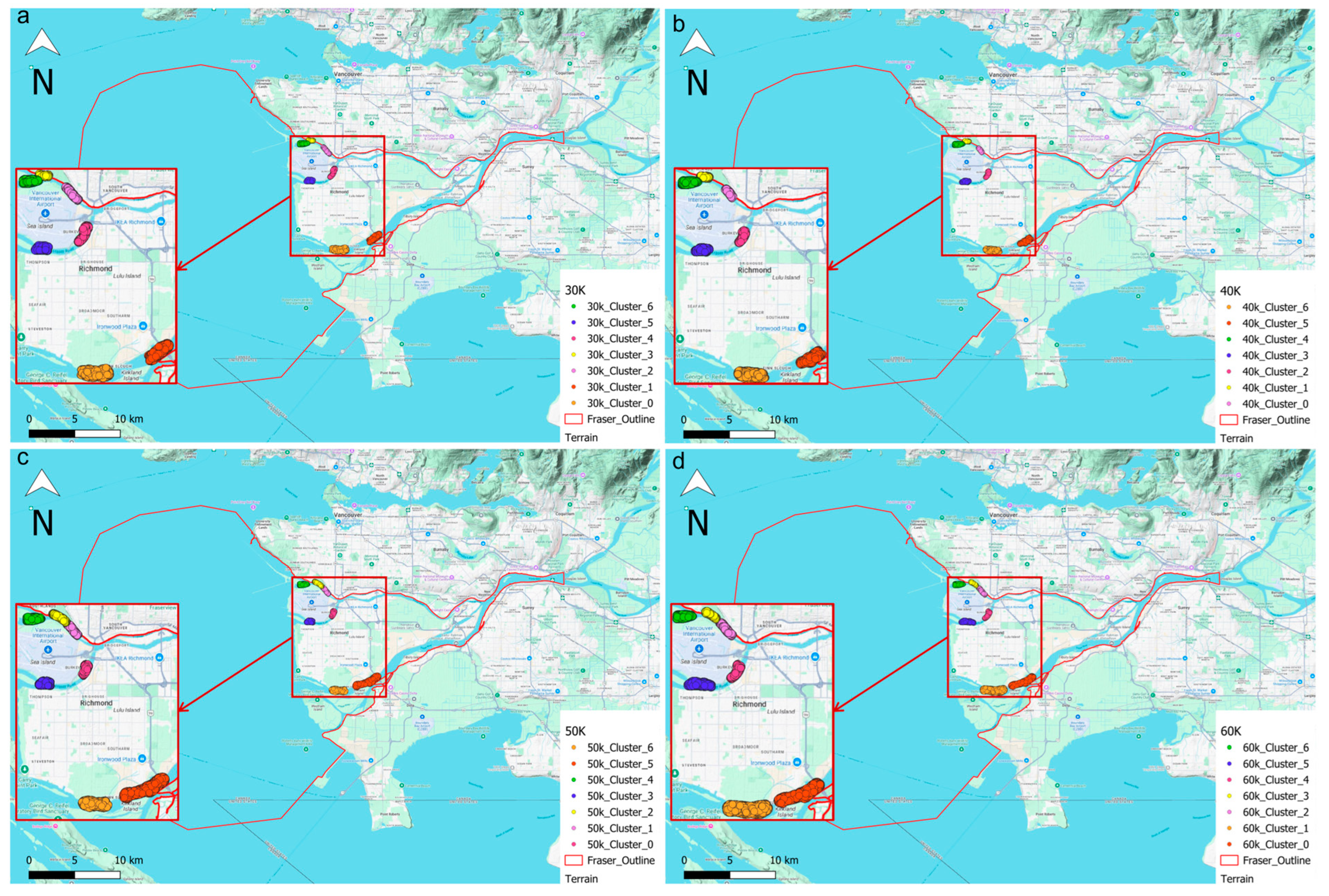 - Ester, M.; Kriegel, H.-P.; Sander, J.; Xu, X. A density-based algorithm for discovering clusters in large spatial databases with noise. In Proceedings of the KDD’96: Second International Conference on Knowledge Discovery and Data Mining, Portland, OR, USA, 2–4 August 1996; Volume 96, pp. 226–231. [Google Scholar]
