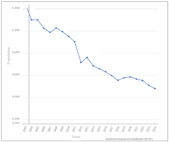 According to Rivera Escribano (2023) [49] remote rural areas in the process of population decline are highly vulnerable and sensitive to population movements, and in the case of Buenavista del Norte, this is manifested in a very significant way. In view of this territorial singularity, from a demographic point of view, Buenavista del Norte has followed in the footsteps of other municipalities in the region with a demographic profile characterised by a mainly ageing population. The population is dispersed, although it is particularly concentrated in the town centre. According to data from the Canary Islands Institute of Statistics (ISTAC), the population of Buenavista del Norte in 2003 was 5453 inhabitants compared to 4680 inhabitants in 2024. As can be seen in Figure 2, the evolution of the population in the municipality reflects a gradual decrease over the last two decades, with a loss of 773 inhabitants.