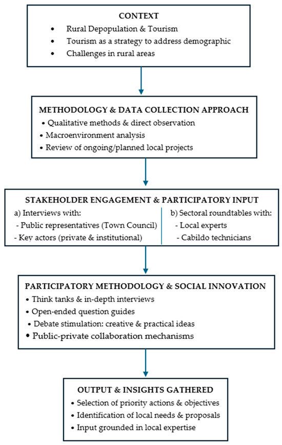While acknowledging the difficulty in addressing and finding a scientific method of analysis that relates tourism in rural areas to the demographic challenge [50], the role of tourism continues to be recognised as an important strategy to combat rural depopulation through the implementation of local policies [19]. In this case, the research was mainly based on direct observation techniques and qualitative methods [51] to achieve the research objectives. During the research process, an analysis of the current state of the projects under development or planned in the municipality was carried out to better identify the reality of the Municipality.