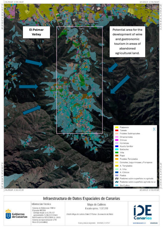 In the case of the Canary Islands, the subject of our analysis, it is a priori paradigmatic that, being recognised as a mature tourist destination and visited annually by 16.2 million tourists [45], there are serious territorial imbalances in terms of population. In fact, in recent decades, the archipelago has been favoured by a disproportionate population growth due to tourism development, which, although it has allowed considerable progress in terms of the economy, especially in coastal areas, has not been the same for rural areas, where some areas of the islands have been experiencing depopulation, especially the green islands and some inland districts. The decrease in agricultural land, the lack of generational replacement, the lack of infrastructures or adequate services for entrepreneurship, the scarcity of companies and the lack of interest on the part of young people in the countryside in favour of other professions not linked to the primary sector, have been some of the key factors in understanding this process of decline and in which the development of typologies such as wine tourism are considered key to its recovery [46].