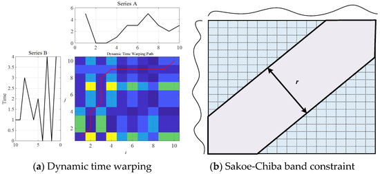 Dynamic Time Warping (DTW) [31], as shown in Figure 1a, is an algorithm based on dynamic programming (DP) to measure the similarity between two time series. DTW has been widely used in various fields such as speech recognition [32], gesture recognition [33], and data mining [34]. The Sakoe-Chiba band constraint, as shown in Figure 1b, is a method to limit the degree of time warping in the DTW algorithm, which defines a band-shaped area on the distance matrix and only allows points within the area to be matched, thereby limiting the degree of time warping to improve the efficiency and accuracy of the algorithm [35]. The process of the DTW method based on the Sakoe-Chiba band constraint is as follows:
