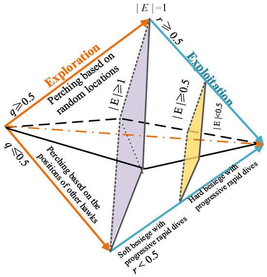 The Harris Hawks Optimizer (HHO) is a population-based, gradient-free optimization technique inspired by the heuristic cooperative predation behavior observed in Harris hawks groups, as shown in Figure 2, which includes prey exploration, surprise attacks, and various attack strategies [35,36,37]. In the HHO, the positions of different Harris hawks within the population are abstracted as potential candidate solutions to the optimization problem, with the optimal solution corresponding to potential location of the target. The operational mechanism of the HHO primarily encompasses three phases: exploration, transition, and exploitation. These phases are succinctly described below.