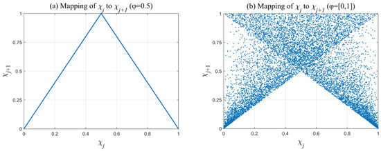 The skew tent chaotic map (STCM) [41], as shown in Figure 5, is used in this study to improve the performance of the initial population. The skew tent chaotic map is a nonlinear, piecewise-defined function widely used in chaos theory and related applications. It is a variant of the standard tent map, designed to generate chaotic sequences with specific properties, thereby ensuring the diversity of the initial population. The STCM is defined as follows: