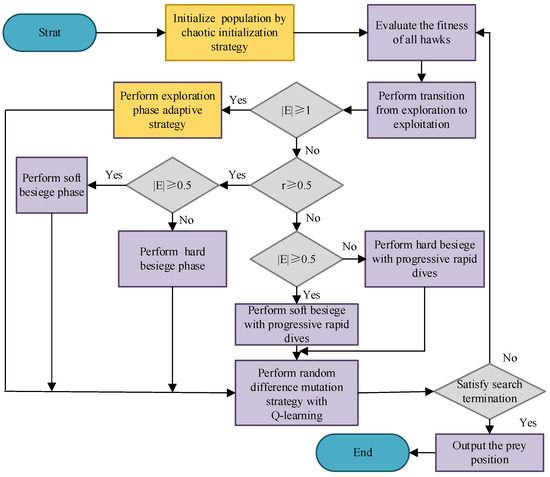 In recent years, due to the high efficiency and ease of implementation of heuristic algorithms, they have been designed and employed as powerful solvers for many reservoir operation problems. These methods mainly include the Whale Optimization Algorithm (WOA) [25], which is based on whale behavior; the Marine Predators Algorithm (MPA) [26], which simulates the behavior of predators in marine ecosystems; and the Harris Hawks Optimizer (HHO) [27], inspired by the hunting behavior of eagle groups. The HHO algorithm has garnered widespread attention from researchers across various fields and has been successfully applied to tasks such as feature selection [28], image segmentation [29], vehicle routing [30] and so on. Despite its excellent search performance, the HHO algorithm has certain limitations. For instance, the random generation of the initial population is influenced by hardware conditions, making it difficult to ensure population diversity. Additionally, there is an imbalance between exploration and exploitation in multiple local optimum optimization problems, which can impede accurately locating the global optimum or lead to search stagnation. Therefore, it is both important and meaningful to study and develop an improved version of the HHO algorithm to enhance reservoir operation optimization.
