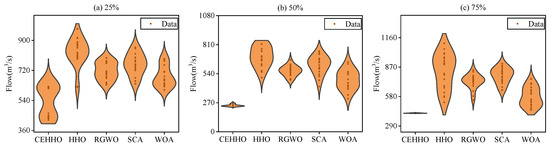 To further examine the effectiveness of the CEHHO, the statistical results of the target values of the five optimizers at 25%, 50%, and 75% frequencies were recorded over 20 repetitions, as shown in Figure 9. The results in Figure 9 indicate that, under all three water inflow frequencies, the proposed method consistently finds better and more stable solutions compared to other mature optimizers. These observations are also consistent with the results presented in Table 2.