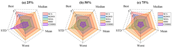 Figure 10 shows the statistical ranking of the best value, median, mean, worst value, and STD of different meth. As shown in the inflow scenario shown in Figure 10a, the proposed method performs poorly in terms of standard deviation compared to other methods, but it obtains the best ranking for other metrics. In addition, combined with the data in Figure 9a, it can be clearly seen that the overall distribution of the proposed method is better than that of other methods. In the inflow scenarios shown in Figure 10b,c, it is obvious that the results of the original HHO method are the worst among all methods. In contrast, the proposed CEHHO method outperforms all other methods and obtains the highest ranking. This clearly demonstrates the effectiveness of the proposed strategy.