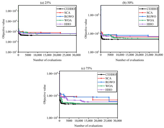Figure 11 further illustrates the convergence curves of different methods under three frequencies. As shown in Figure 11, SCA performs the worst at the 25% frequency and performs averagely at the 50% and 75% frequencies. The HHO algorithm exhibits average performance across all three frequencies. In contrast, the proposed CEHHO method demonstrates the best convergence speed and accuracy among the three frequencies. This fully demonstrates the effectiveness and efficiency of the proposed method.