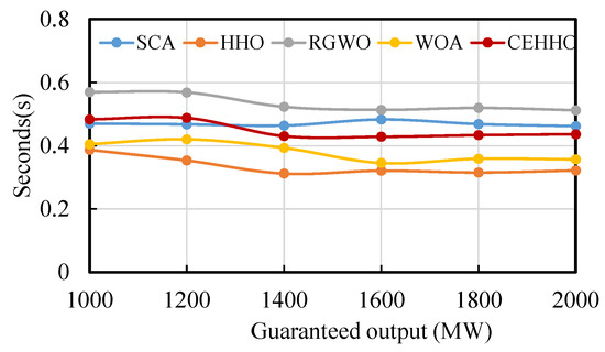Building on the results presented in Table 3, Figure 12 illustrates the average CPU execution times of the five methods under various guaranteed output limits, validating the efficiency of each algorithm. All algorithms were executed in the same hardware and software environment. The execution time for each run was recorded, and the average values were calculated to facilitate a statistical comparison of the execution times of different algorithms. Figure 12 demonstrates that with varying guaranteed output limits, the solution times for all methods remain relatively stable. The average execution times for the SCA, HHO, RGWO, WOA, and CEHHO methods are 0.47 s, 0.34 s, 0.53 s, 0.38 s, and 0.45 s, respectively. The HHO method exhibits the highest efficiency, while the improved CEHHO method shows a moderate execution time. This suggests that the proposed method achieves improved solutions at the cost of an additional runtime of 0.11 s. Compared to other optimization techniques, the proposed CEHHO method effectively reveals an enhanced ecological scheduling scheme for reservoir operations without significantly increasing the algorithm runtime.