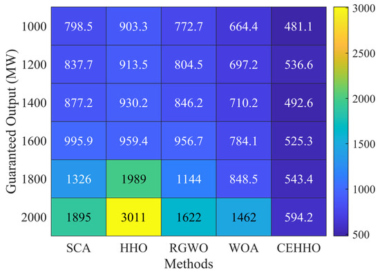 To analyze the performance trends of various methods under different guaranteed output constraints, Figure 13 presents the average statistical results for each method, where darker colors represent better performance metrics. As the guaranteed output requirements increase, it is evident that the target values for all methods generally rise, highlighting the growing difficulty in finding optimal solutions across the board. Notably, the increases for the SCA, HHO, RGWO, and WOA methods are particularly pronounced. In contrast, the proposed method maintains target values between 480 and 600 and consistently outperforms the others in every guaranteed output constraint scenario. Specifically, under the condition of a guaranteed output of 2000 MW, the performance of the SCA, HHO, RGWO, and WOA methods is suboptimal, while the proposed method achieves a superior average result. This clearly demonstrates the stability and effectiveness of the proposed approach.