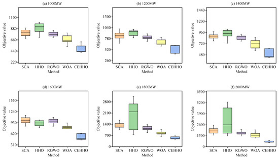 To clearly analyze the distribution of target value results across multiple runs, Figure 14 provides the box plot statistics for different methods. The box plot allows for an intuitive observation of the distribution of target values for each method, including the mean and interquartile range. Specifically, the target value distributions of the SCA and RGWO methods are concentrated, indicating that these methods offer more consistent solutions during the optimization process. The HHO method shows considerable variability, suggesting that its results may differ significantly between runs. The WOA exhibits a relatively poor distribution in the 1000 MW to 1400 MW output limit scenario, while it demonstrates improved stability in the 1600 MW to 2000 MW output limit scenario. The proposed CEHHO method maintains a concentrated solution distribution within an optimal target range across all output scenarios. This analysis provides a crucial basis for evaluating and comparing the optimization performance of different methods, indicating that the proposed method demonstrates superior stability and practicality.