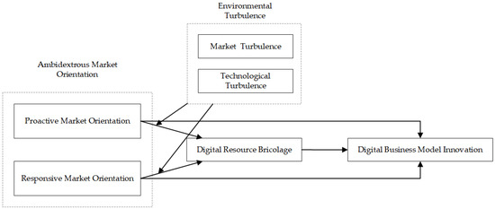 Three gaps motivate this study. First, the applicability of traditional market-oriented theories in digital contexts has yet to be fully validated. Second, although ambidextrous market orientation—the balanced and concurrent deployment of proactive and responsive market orientations—has been shown to enhance innovation and performance, the specific relationship between ambidextrous market orientation and DBMI has received little empirical attention, as most prior work examines product or general innovation rather than DBMI [13,14]. Filling this gap advances theoretical understanding by positioning ambidextrous market orientation as a demand-side microfoundation that complements resource-side perspectives in explaining how DBMI reconfigures the mechanisms of value creation and capture at the business-model level—the central lever of competitive advantage [4,15]. In practical terms, clarifying how proactive and responsive market orientations can be orchestrated to drive DBMI offers firms actionable guidance for redesigning business models and sustaining organizational renewal in turbulent, digitally enabled environments [7,8]. Third, we lack evidence on how ambidextrous market orientation yields DBMI outcomes via resource-side mechanisms that are consistent with digital recombination and how these relationships unfold under environmental turbulence. To address these gaps, we conceptualize ambidextrous market orientation as the simultaneous and balanced pursuit of proactive and responsive market orientations and investigate their comprehensive effects on DBMI, explicitly incorporating resource-side processes and contextual turbulence into an explanatory framework [13].