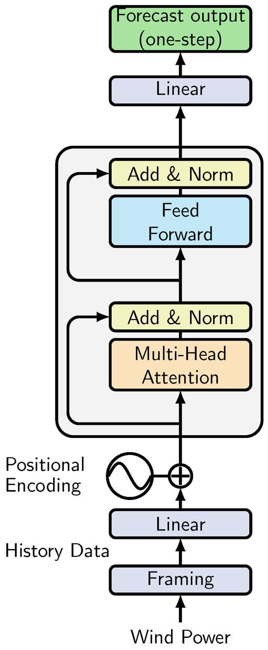 The final encoder output is aggregated and passed through a linear projection layer to produce the next value . Unlike multi-step autoregressive decoding, this formulation avoids the need for a decoder with masked attention, reducing parameters and computation while aligning with the single-step prediction objective. The architecture adopted in this study, illustrated in Figure 1, is an encoder-only Transformer tailored for short-term wind power forecasting. By relying on self-attention, the model captures both short-term fluctuations and long-range temporal dependencies within the input window. Unlike language models, no sequence tokens (e.g., start-of-sequence or end-of-sequence markers) are required, since the task involves continuous numerical values. The representation of the historical window is directly mapped through a linear output layer to forecast the next observation, which simplifies the design while preserving the ability to model complex temporal patterns.