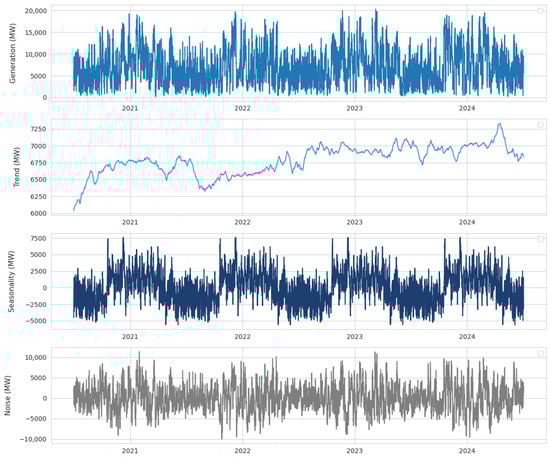 To gain deeper insights into the temporal structure of the series, Figure 3 presents a classical additive decomposition into trend, seasonal, and residual components, with an annual cycle specified on hourly data. The trend component shows a progressive increase in wind power generation over the years, reflecting broader structural changes in the energy mix. The seasonal component highlights recurrent annual cycles, indicating systematic variability linked to meteorological conditions. At the same time, the residual component captures high-frequency fluctuations and abrupt changes, pointing to short-term dependencies that characterize the volatility of wind generation. Together, these patterns confirm that the series exhibits both short-term and long-term dependencies, thereby justifying the adoption of a Transformer-based architecture capable of capturing temporal dynamics across multiple scales.