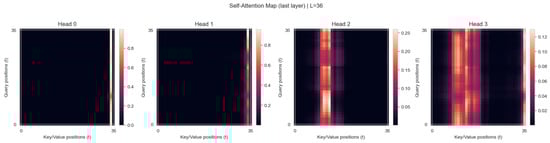 Importantly, the attention maps for the 36 h horizon revealed that most heads concentrated their weights on the most recent hours, highlighting the dominant role of short-term dynamics in wind power variability. Nevertheless, certain heads distributed attention more broadly across intermediate and even earlier positions within the input window, suggesting that the model simultaneously captured longer-range dependencies. This division of roles across attention heads indicates a complementary mechanism in which recent fluctuations are emphasized while broader temporal patterns are also considered (see Figure 4). Consequently, the 36 h input horizon demonstrated that extended context lengths enable the Transformer to leverage both short- and long-term information.